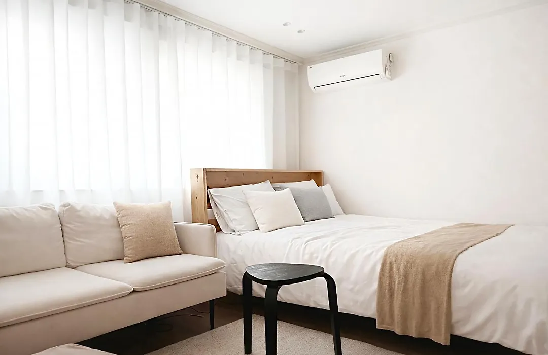 The apartment includes a sitting area with air conditioning for utmost comfort. A highlight of Modern Wood Stay, Hongdae Seoul apartment for guests is the presence of hairdryers, bath sheets, and slippers in the bathroom. Additionally, you'll find a separate toilet, a shower, and a washing machine.